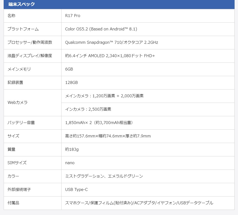 R17 Proはスペックが高いだけでなく、背面が美しく、カメラの性能も好評のスマートフォンです。